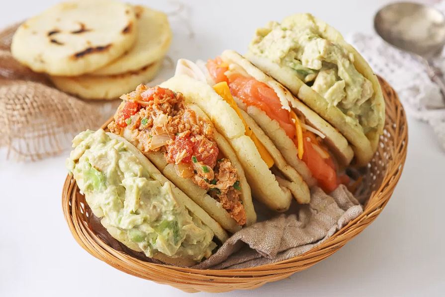 Arepa especial con carne y pollo desmechado, tocineta y quesillo